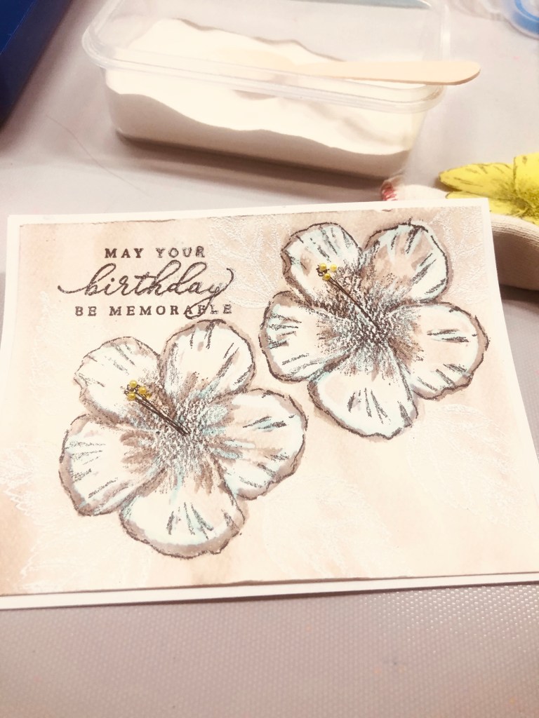 After heat embossing I adhered the watercolor paper to a piece of whisper white card stock and then on the front of an A2 card