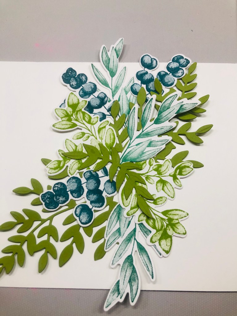 Then this afternoon I watched a video by Jennifer McGuire demonstrating the Split Card Technique and I thought to myself this would work beautifully for this bundle. So, yes I did, I pulled out the dies and stamps and created a pile of foliage.